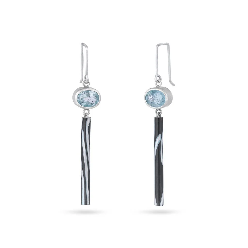 Salt and Pepper Aquamarine Earrings with Blackened Drops and Silver Inlay